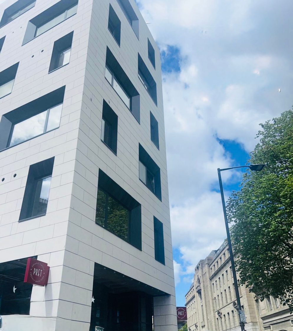 On the upper floors & staircase zones we installed our CWCT Sequence B tested Prometheus ‘Discrete Fix’ Aluminium Cladding System to perfectly compliment the stone! A crisp, clean finish i’m sure you will agree?